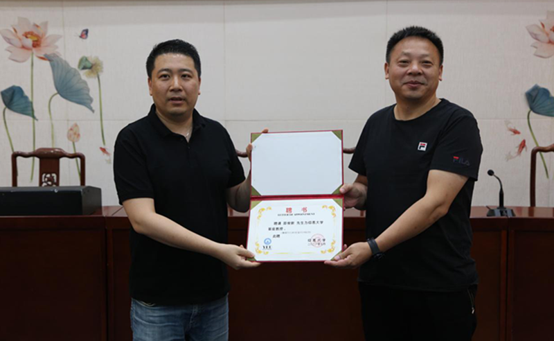 在会上,张文副教授向邵俊新先生颁发了客座教授聘任书,两人合影留念。之后,邵俊新教授就受聘发表了感言。