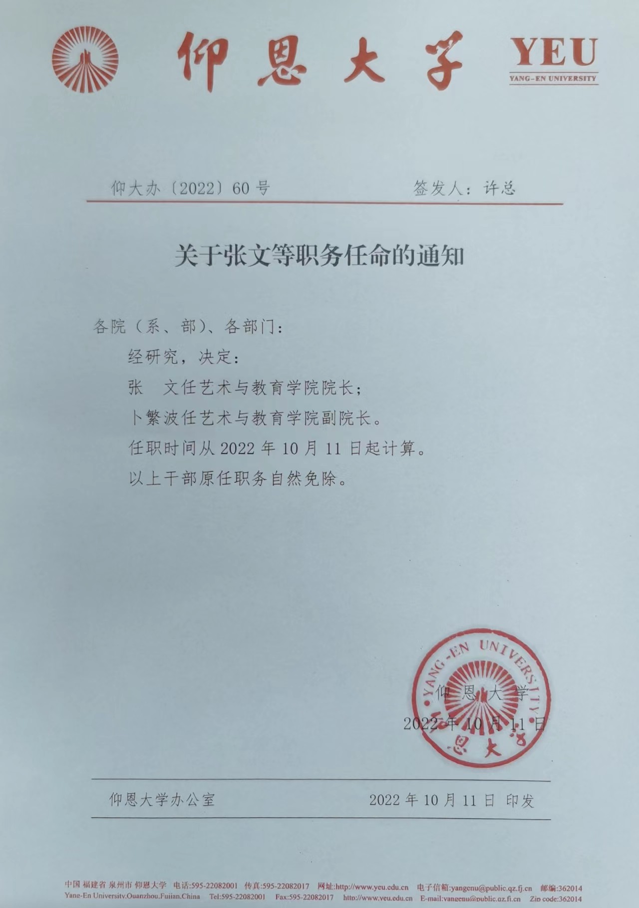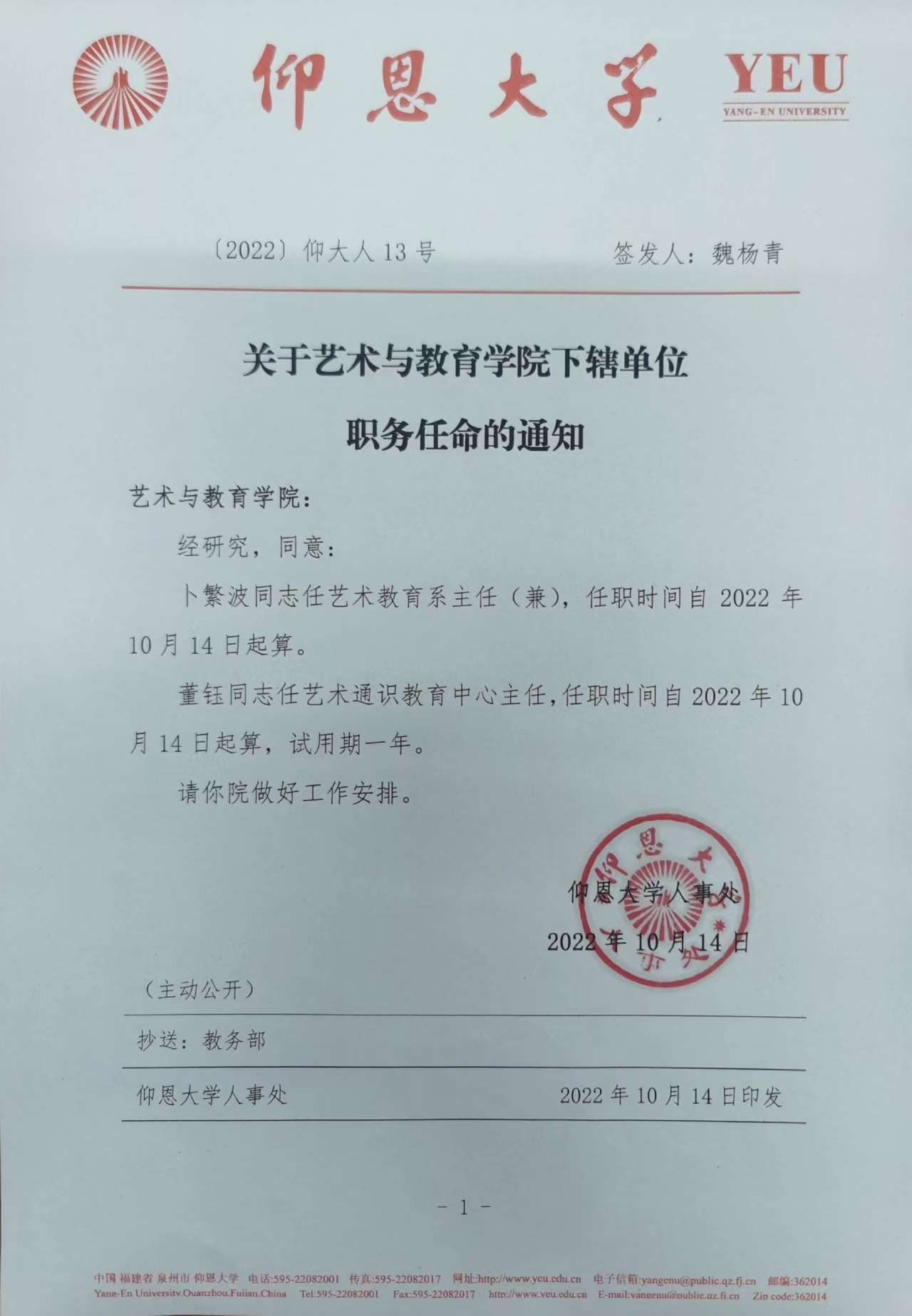 董钰同志任艺术通识教育中心主任,任职时间自2022年10月14日起算,试用期一年。