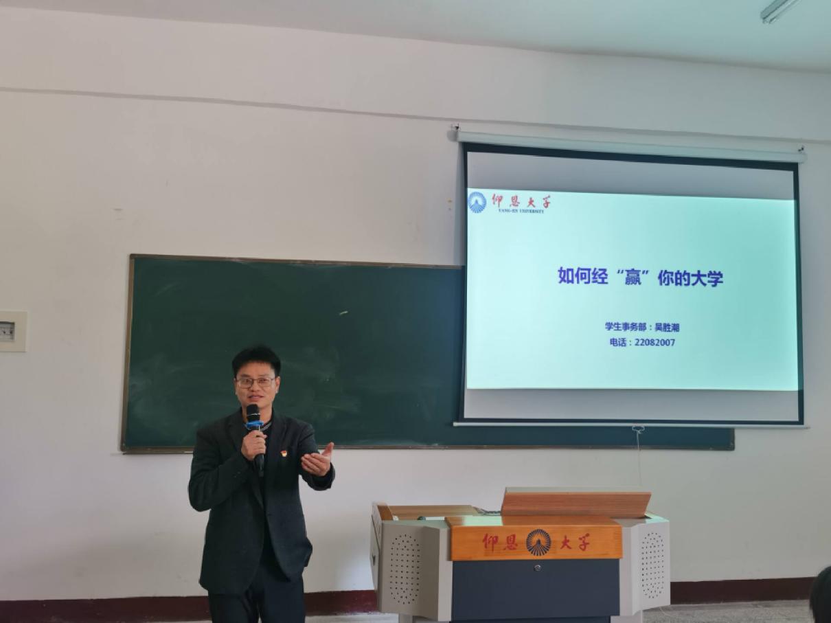 吴胜潮深入浅出地讲解了校训的精神内涵。他强调,校训是一所学校的育人之纲,而校训“学会做人,守信笃行;学会做事,创业有成。”正是引领一代代仰恩人勤奋卓绝,戮力同心的精神动力,是仰恩师生心血共同凝结的体现。他勉励同学们要在今后的学习生活中了解、培养校训精神,脚踏实地践行校训精神。