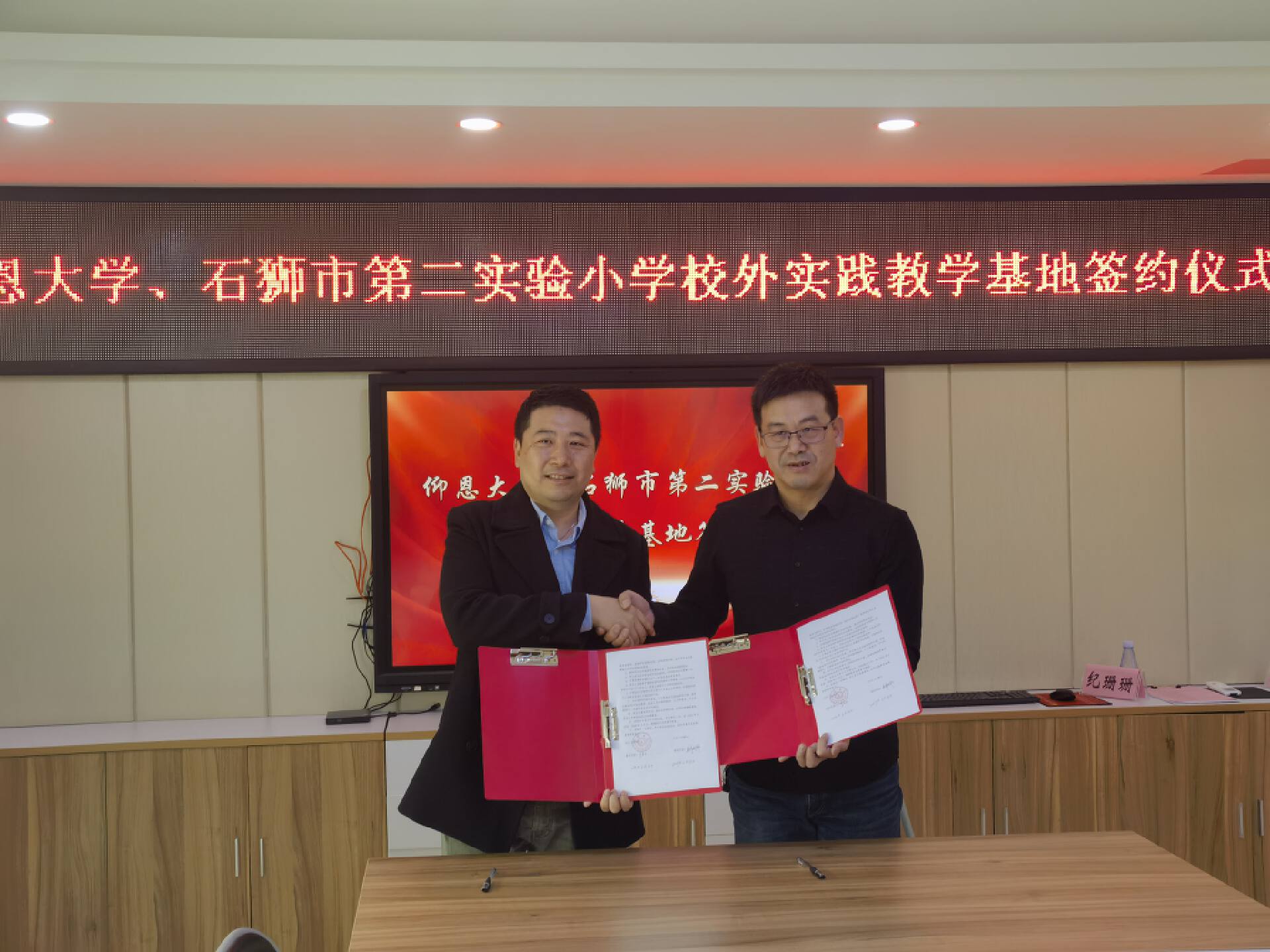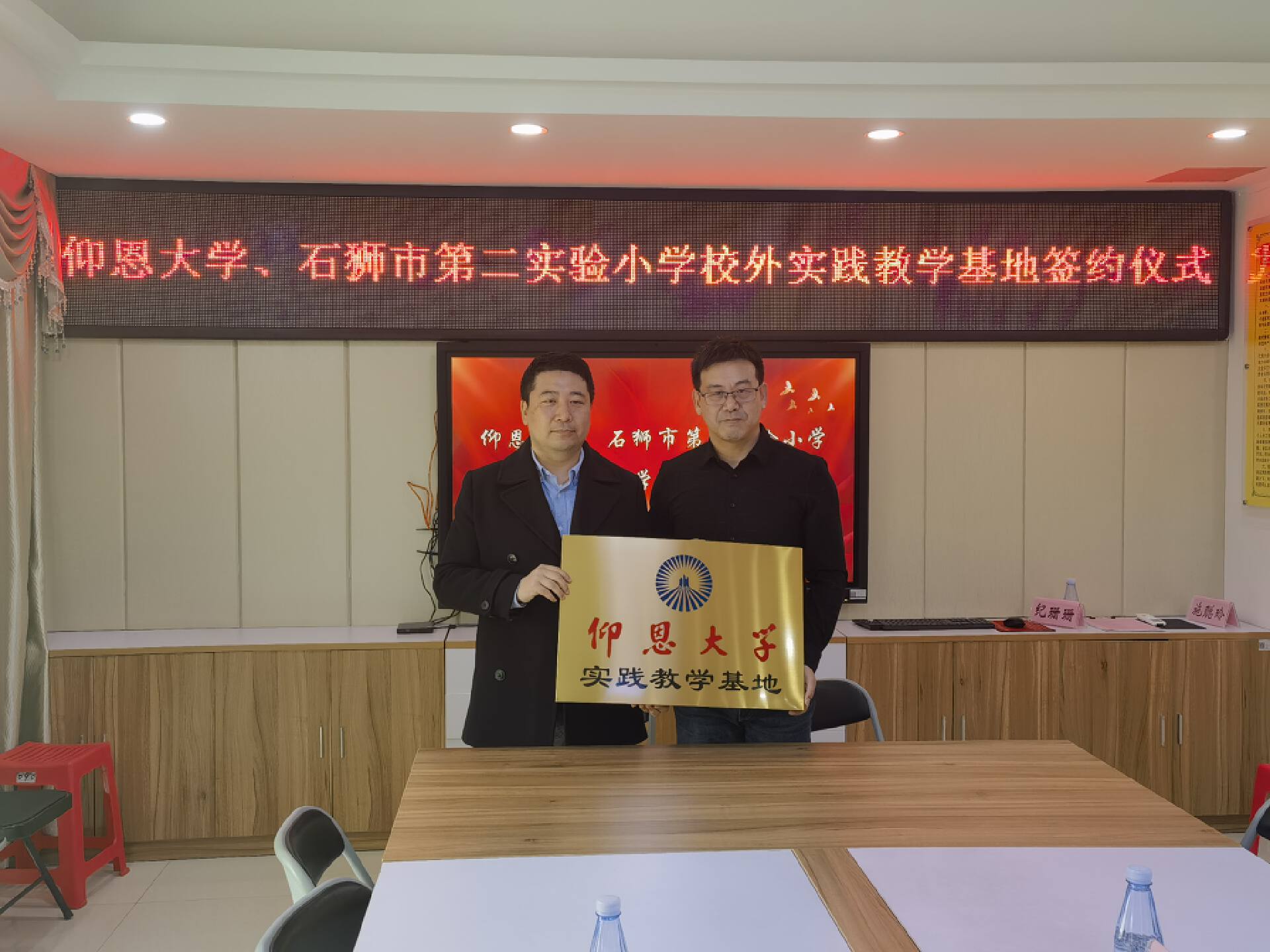 随后,实践教学基地签约暨揭牌仪式正式举行。张文院长与吴毅超校长代表双方签署了协议书。随后张文院长为石狮市第二实验小学授牌。