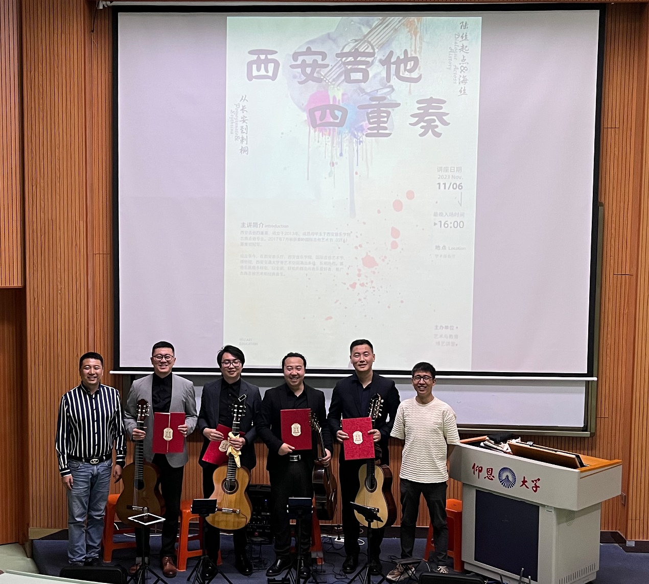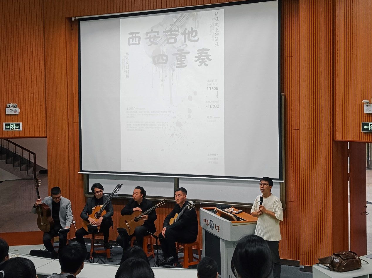 为引领学生树立正确的艺术观,传承中华美育精神,培养良好人文素养和音乐鉴赏能力,助力学生全面发展、健康成长。2023年11月6日下午,Best365官网博艺讲堂——《丝路幻想——吉他合奏讲座》顺利举办。此次讲座特邀“西安吉他四重奏”进行现场演奏与讲解。Best365官网院长张文、副院长卜繁波等一众老师与Best365官网的学生们一同聆听讲座。讲座由副院长卜繁波主持。